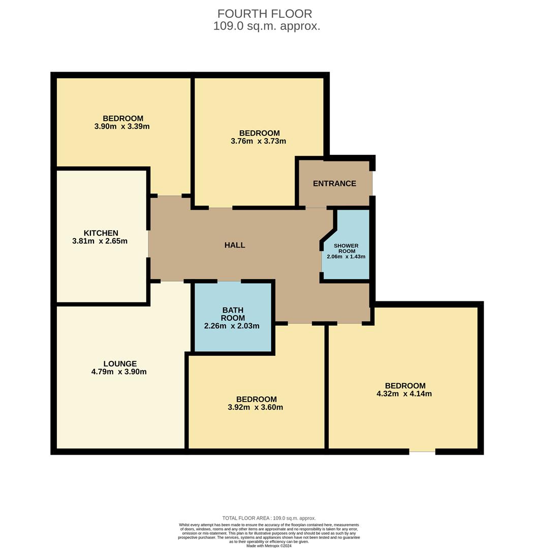 Large living room, well equipped kitchen with integrated oven, hob and extractor, four double bedrooms, three piece fully tiled bathroom and mainly tilled shower room.