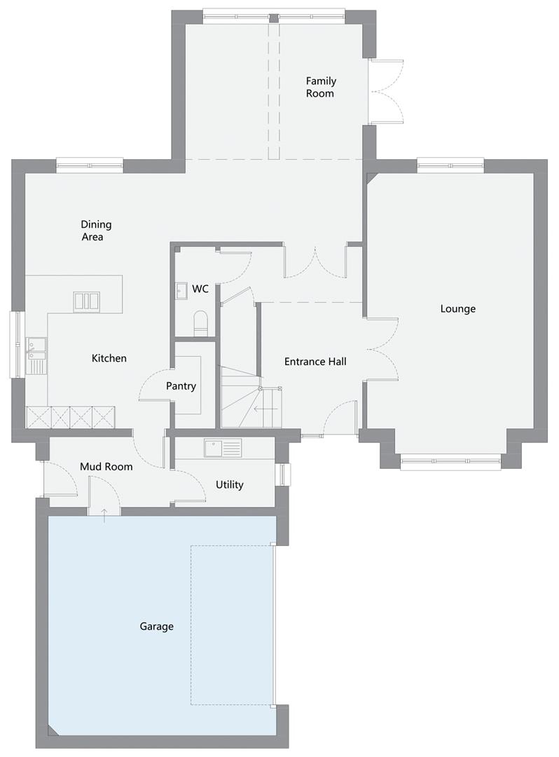 Functionality is built into every aspect of The Jura. At the front of the property, a practical mudroom provides a dedicated space for everyday essentials, with direct access to the rear garden—ideal for families with pets or outdoor lifestyles. A separate utility room and an integral double garage add further convenience and storage options, ensuring the home meets the demands of contemporary family life.
