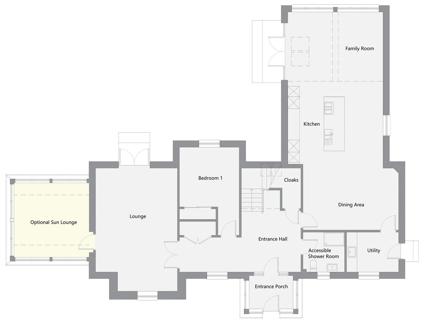 To the side of the main living area, a large formal lounge enjoys a dual aspect and features French doors opening onto an expansive patio, creating the perfect indoor-outdoor flow for summer entertaining or relaxing with a good book. For those looking to create an even more luxurious living space, The Coleburn also offers the option to add a sunroom extension off the lounge—a perfect retreat for quiet moments and sunny afternoons.
