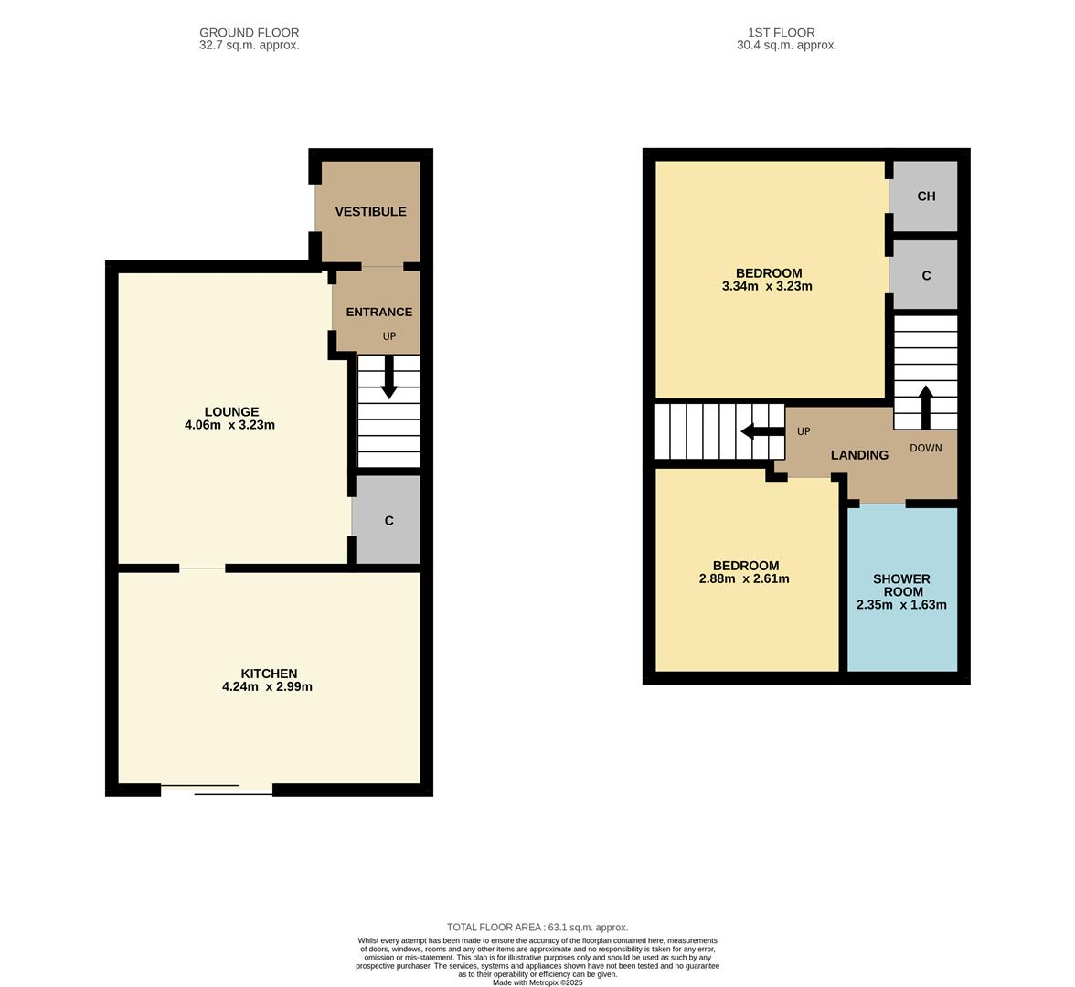 Upstairs, the generous master bedroom offers ample space and includes fitted wardrobes, while the second double bedroom provides plenty of room for additional furniture. The family shower room has been thoughtfully designed, featuring a walk-in shower, WC, wash hand basin, and a heated towel rail for added convenience and comfort.